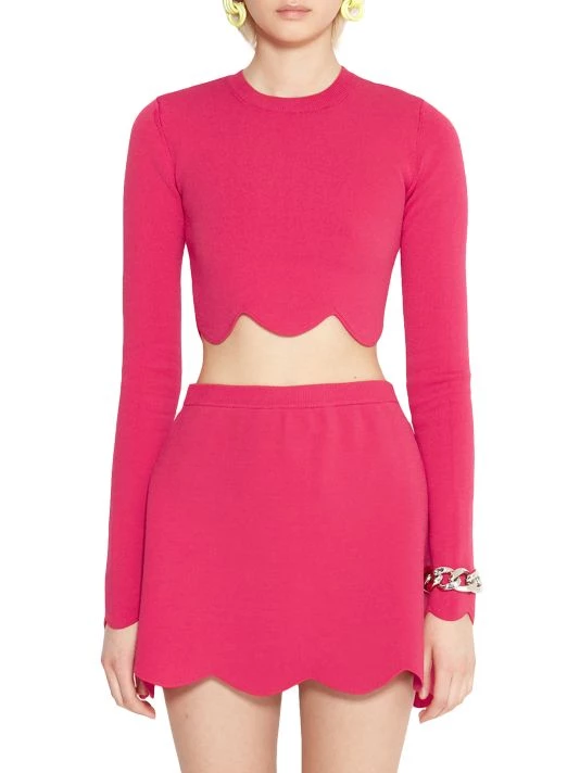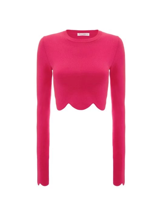 JW Anderson’s collection boasts an abstract take on pandemic-induced life and gender bias with oversized silhouettes, side cutouts, structured asymmetric hems, and rubber and metal embellishments. Almost lacking cohesion, the individual looks are meant to evoke senses of fantasy and play. Cut in an ultra-cropped-silhouette, JW Anderson’s long-sleeve top is defined by a dimensional scalloped hem and contrast logo patch at the back.