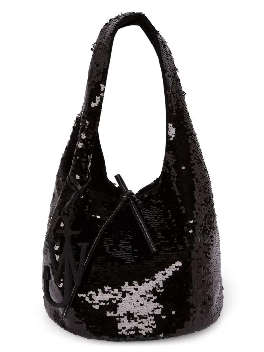 JW Anderson’s sequin shopper is detailed with a removable logo tag and a tie closure.