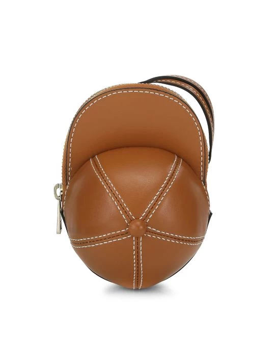 From the Cap Collection. JW Anderson turns the classic baseball cap into a shoulder bag full of whimsy. Crafted of paneled leather, this artisanal piece features contrast topstitch, silvertone hardware, and a removable crossbody strap.