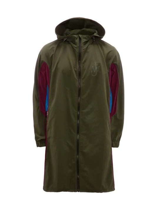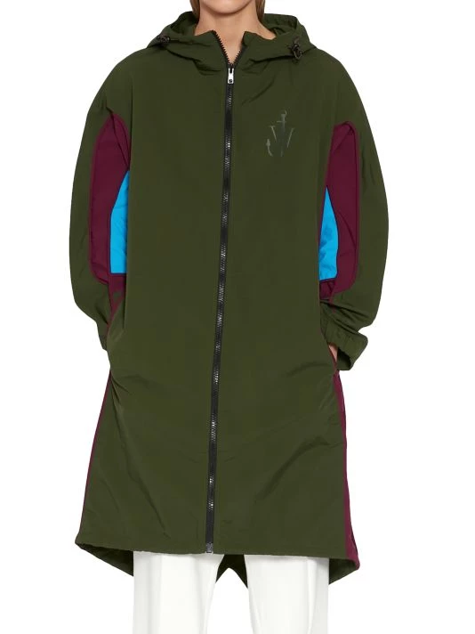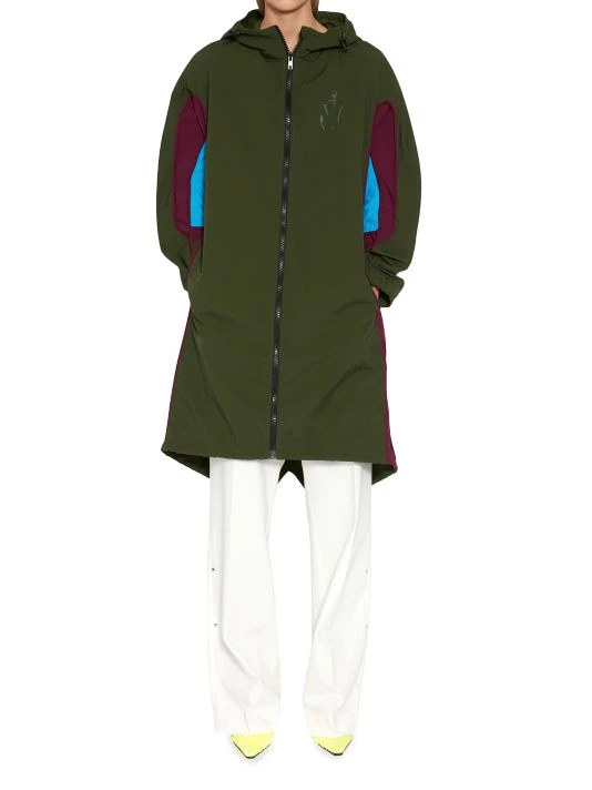 JW Anderson’s collection boasts an abstract take on pandemic-induced life and gender bias with oversized silhouettes, side cutouts, structured asymmetric hems, and rubber and metal embellishments. Almost lacking cohesion, the individual looks are meant to evoke senses of fantasy and play. Cut in an oversized silhouette, JW Anderson’s hooded colorblocked parka boasts a chest logo and an asymmetric drawstring hem.