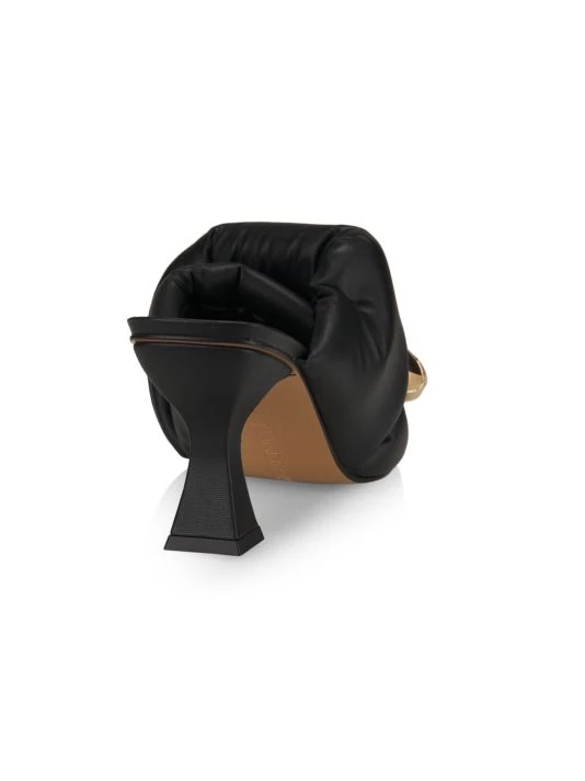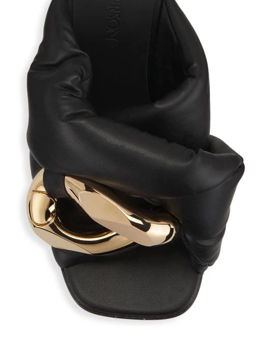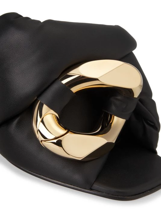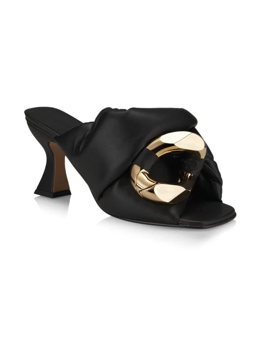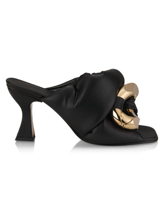 JW Anderson’s mules are crafted of padded faux leather. Made in Italy, this slip-on style has a twisted vamp design with a goldtone chain accent.