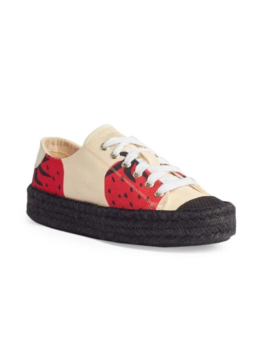 Strawberry-print sneakers enhanced with a braided midsole and toe cap.