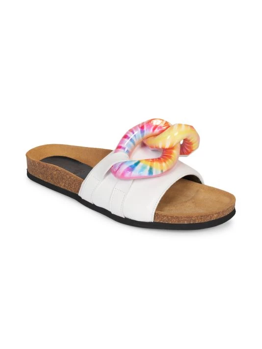 Made in Spain of rich leather, JW Anderson’s slides are topped with oversized tie-dye chains-links. This pair is set on a molded cork footbed.